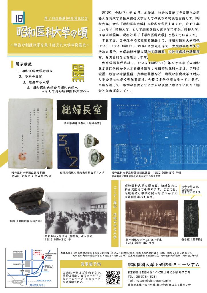 本展では、この度の校名変更を記念して、旧昭和医科大学時代(1946~1964・昭和21~39年)に焦点をあて、大学設立に関する行政文書や、大学施設増築に関わる図面類、旧外来病棟の建築部材、写真資料などを展示します。