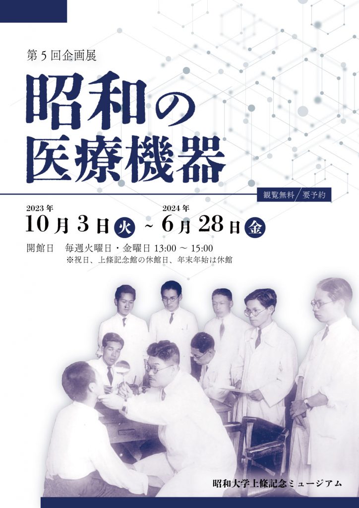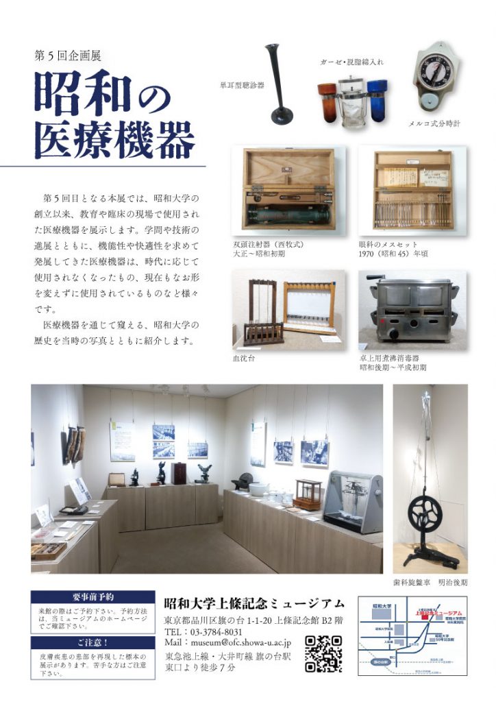 本学の創立以来、教育や臨床の現場で使用された医療機器を展示します。学問や技術の進展とともに、機能性や快適性を求めて発展してきた医療機器は、時代に応じて使用されなくなったもの、現在もなお形を変えずに使用されているものなど様々です。 医療機器を通じて窺える、昭和大学の歴史を当時の写真とともに紹介します。